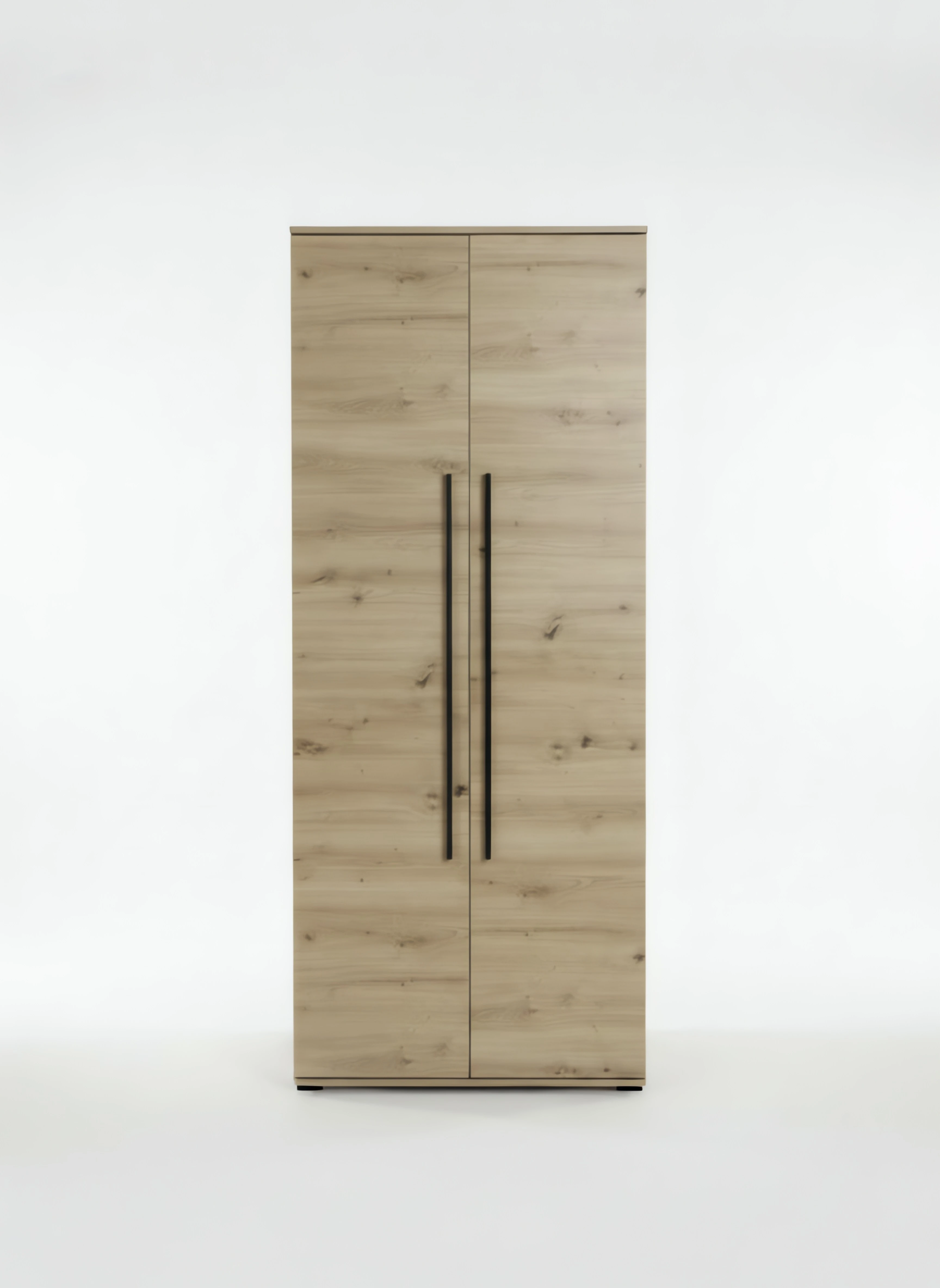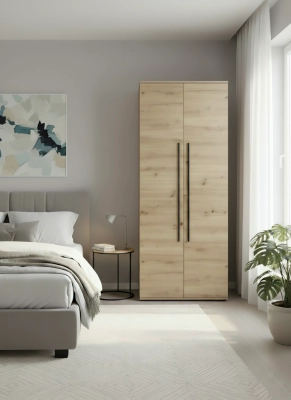 Naturalny odcień frontów sprawia, że mebel wygląda lżej i bardziej przytulnie niż klasyczne, jednolite bryły. Taka szafa dwudrzwiowa z drążkiem pomoże uporządkować ubrania i dodatki, a przy tym dobrze wpisze się w aranżacje skandynawskie, nowoczesne i loftowe. Długie czarne uchwyty ciekawie kontrastują z drewnopodobnym dekorem i nadają całości bardziej zdecydowanego charakteru.