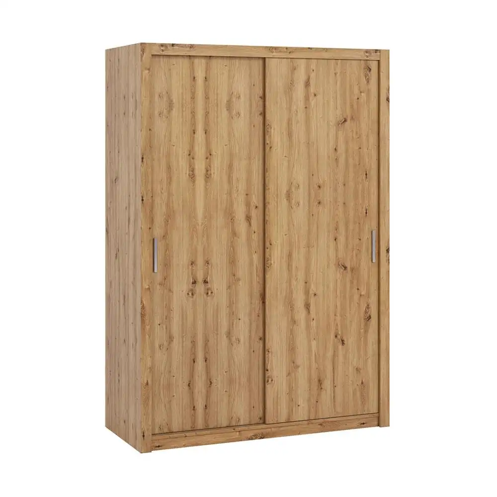 Szafa przesuwna BOREA BO8 150 cm w kolorze dąb artisan to nowoczesna szafa do przechowywania odzieży, która wyróżnia się jasnym, naturalnym dekorem drewna. Doskonale pasuje do aranżacji skandynawskich, nowoczesnych i japandi, wprowadzając do wnętrza lekkość i harmonię. To idealny wybór dla osób szukających szafy przesuwnej 150 cm z półkami i drążkami.