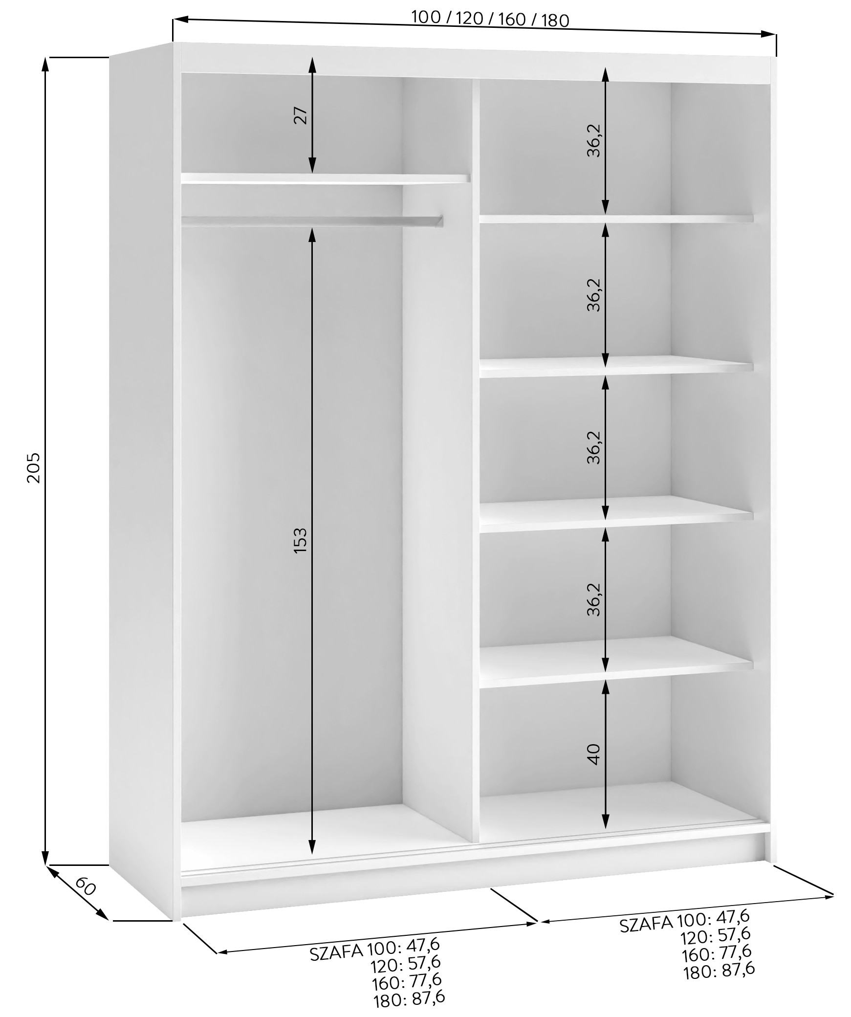 Konstrukcja wykonana z trwałej płyty laminowanej 16 mm zapewnia solidność i odporność na codzienne użytkowanie. Wnętrze szafy zostało zaprojektowane z myślą o maksymalnej funkcjonalności – po jednej stronie znajdują się pojemne półki, a po drugiej drążek na wieszaki. Dzięki temu łatwo zorganizujesz przestrzeń na ubrania, obuwie i dodatki. Aluminiowy system przesuwny firmy Laguna gwarantuje ciche i płynne otwieranie drzwi.