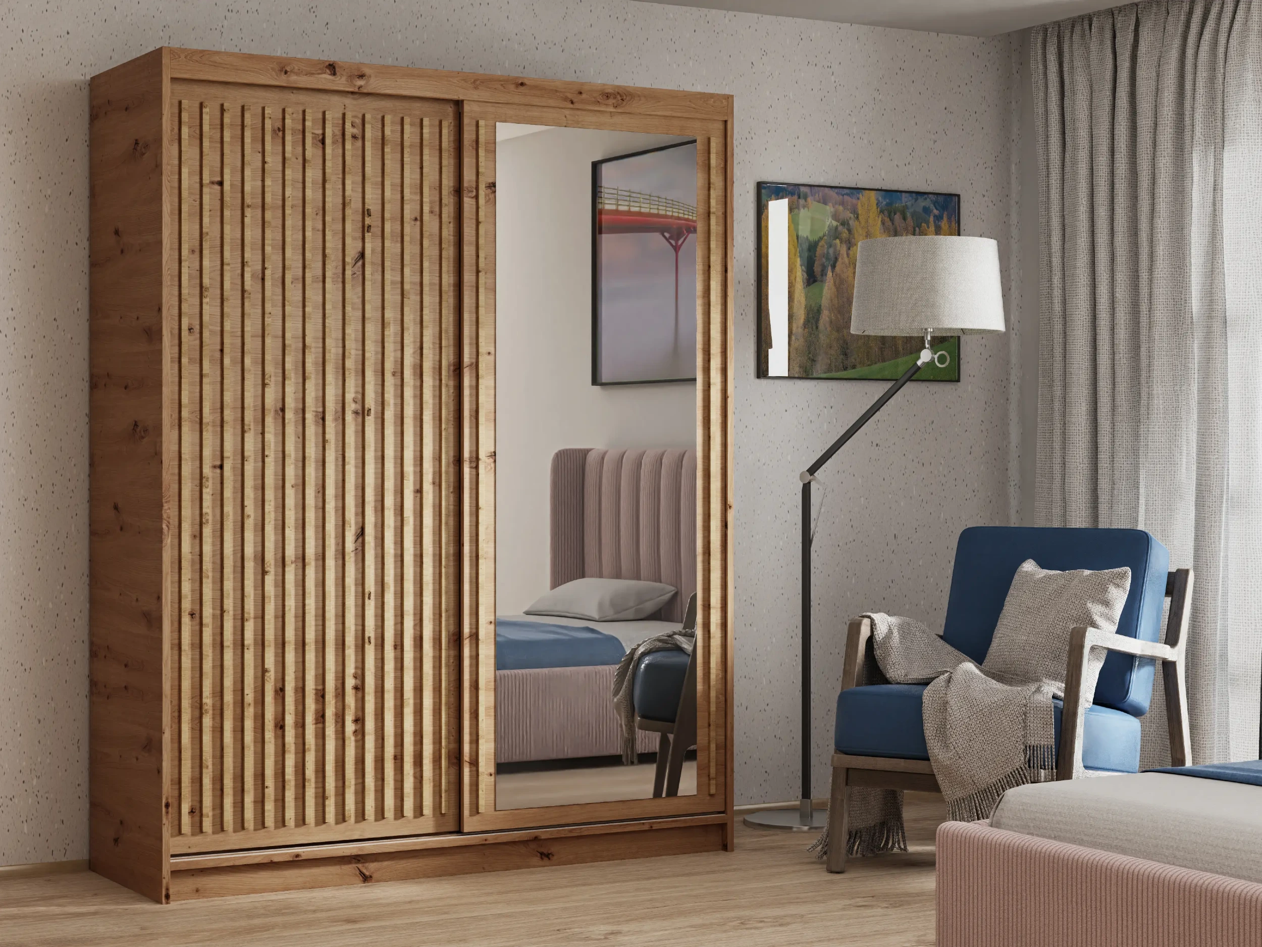 Szafa LAMIRO 180 cm to propozycja dla osób, które cenią dużą pojemność, nowoczesny design i wysoką jakość wykonania. Model ten wyróżnia się ozdobnymi lamelami w naturalnym odcieniu drewna oraz lustrzanym frontem, który pełni nie tylko funkcję praktyczną, ale również optycznie powiększa pomieszczenie i dodaje mu elegancji. To doskonały wybór do sypialni, przedpokoju lub garderoby, gdzie liczy się zarówno funkcjonalność, jak i estetyka.