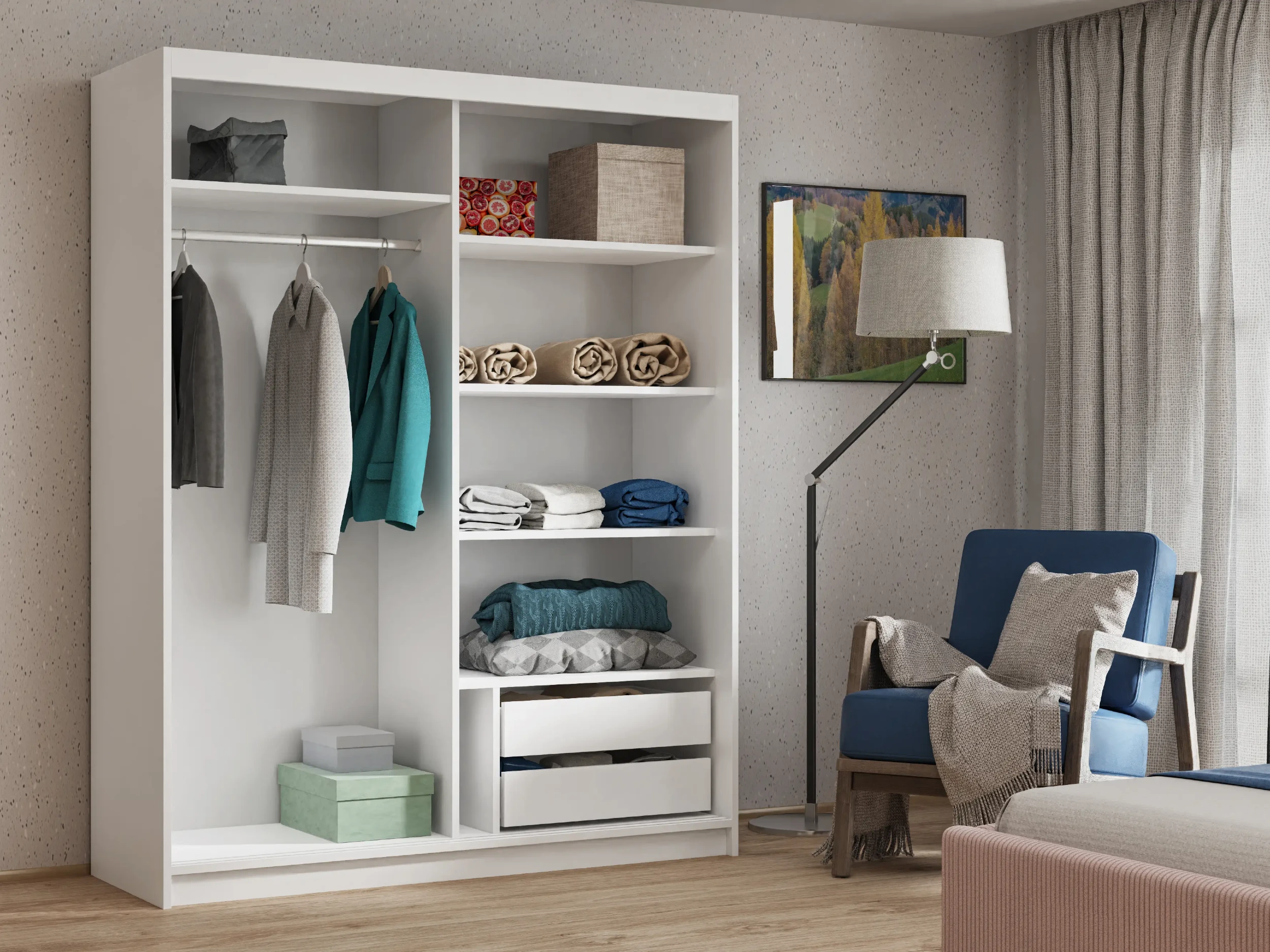 - Przestronne wnętrze z drążkiem, półkami i opcją dodania szuflad,
