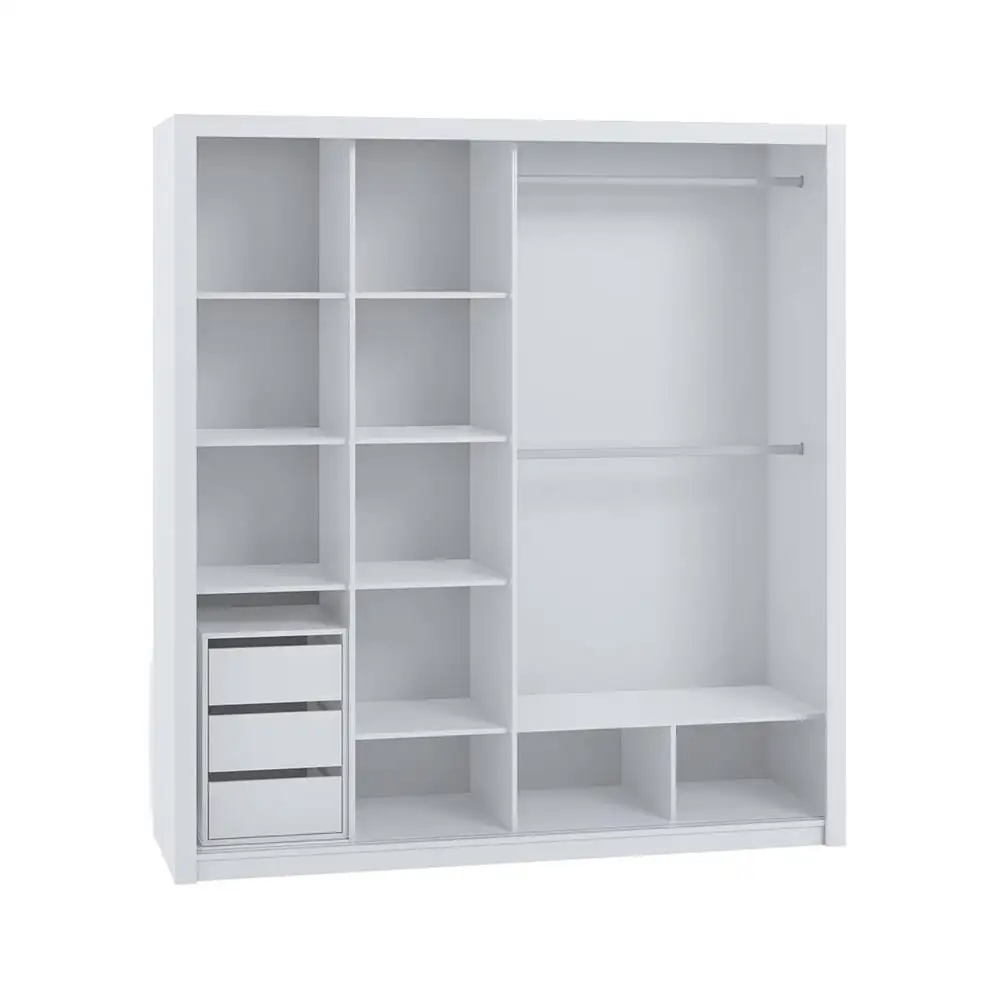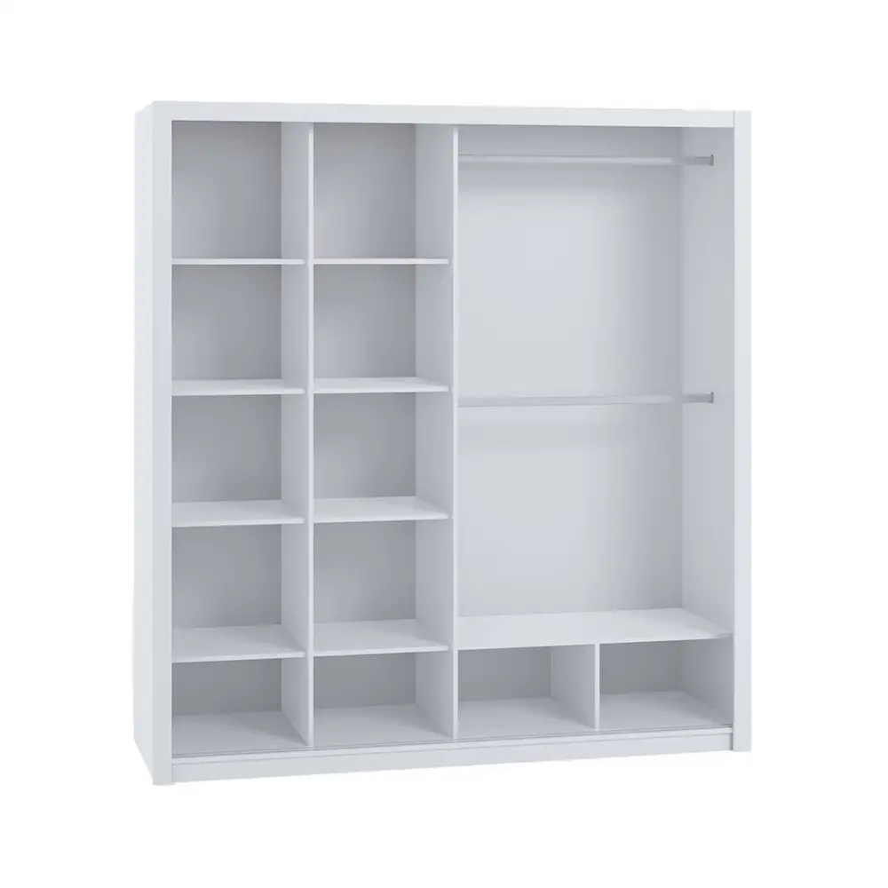 Wnętrze szafy zaprojektowano z myślą o wygodzie – dwa rzędy półek oraz drążek na wieszaki pozwalają uporządkować dużą ilość odzieży bez zagnieceń. Stabilny system przesuwny zapewnia komfort użytkowania. Szafę można rozbudować o kontenerek BOREA BO17.