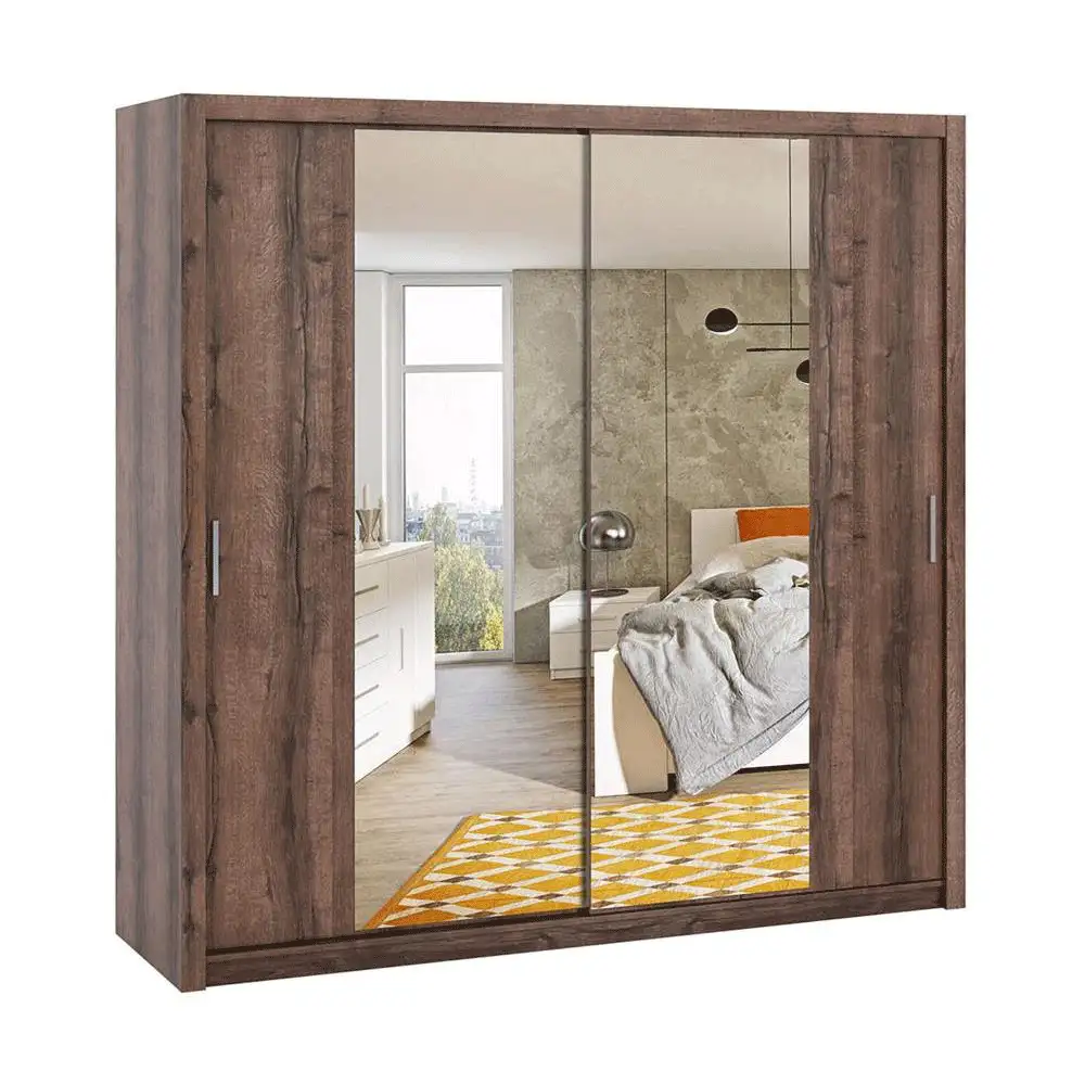 Szafa przesuwna z lustrem BOREA BO15 220 cm w kolorze dąb monastery to pojemna szafa ubraniowa o eleganckim, wyrazistym charakterze. Głęboki dekor drewna w połączeniu z lustrzanymi frontami tworzy nowoczesną całość, która optycznie powiększa przestrzeń i podnosi funkcjonalność wnętrza.