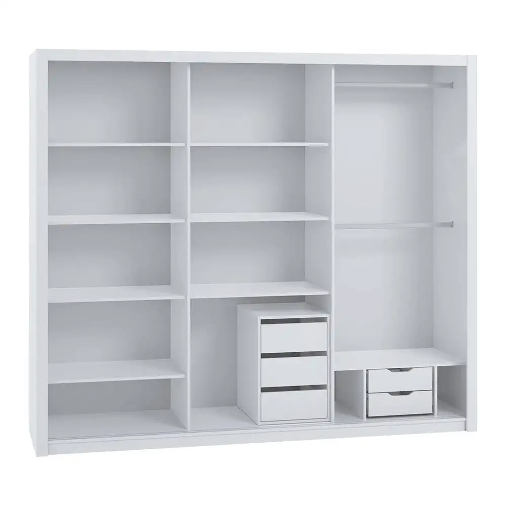 Wnętrze szafy zaprojektowano z myślą o maksymalnej funkcjonalności – dwa rzędy półek oraz liczne drążki ubraniowe umożliwiają wygodne przechowywanie dużej ilości odzieży bez zagnieceń. Szafę można uzupełnić o kontenerek z szufladami BOREA BO17, który nie jest wliczony w cenę.