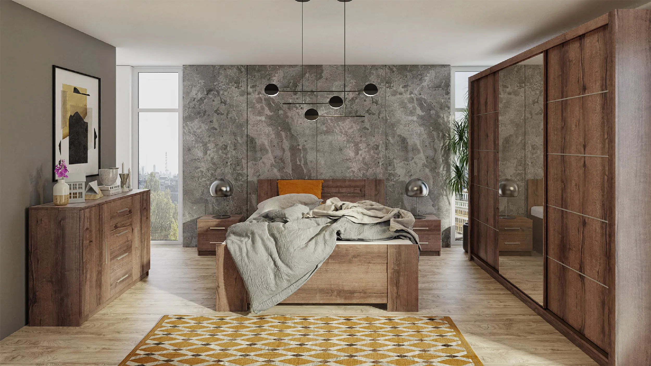 Szafa przesuwna z lustrem BOREA BO16 250 cm w kolorze dąb monastery to wyjątkowo pojemna szafa ubraniowa o eleganckim, wyrazistym charakterze. Głęboki dekor drewna doskonale komponuje się z nowoczesnymi i loftowymi aranżacjami, a lustrzany front przełamuje masywną bryłę mebla, optycznie powiększając przestrzeń.