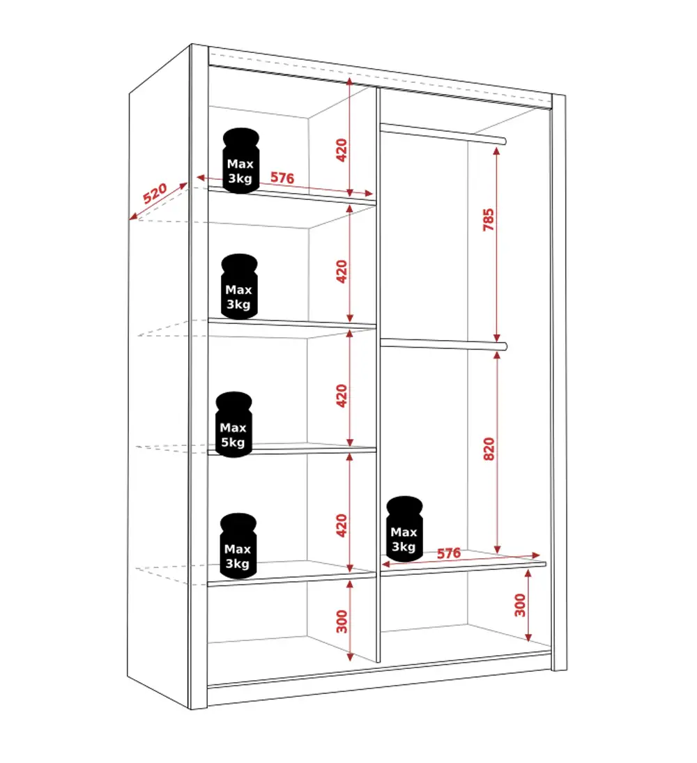 Szafa oferuje półki na ubrania składane oraz drążek na odzież wiszącą, co umożliwia wygodne przechowywanie całej garderoby. Sprawdzony system drzwi przesuwnych zapewnia komfort użytkowania na co dzień, a możliwość dokupienia kontenerka z szufladami BOREA BO17 pozwala jeszcze lepiej zorganizować wnętrze szafy.