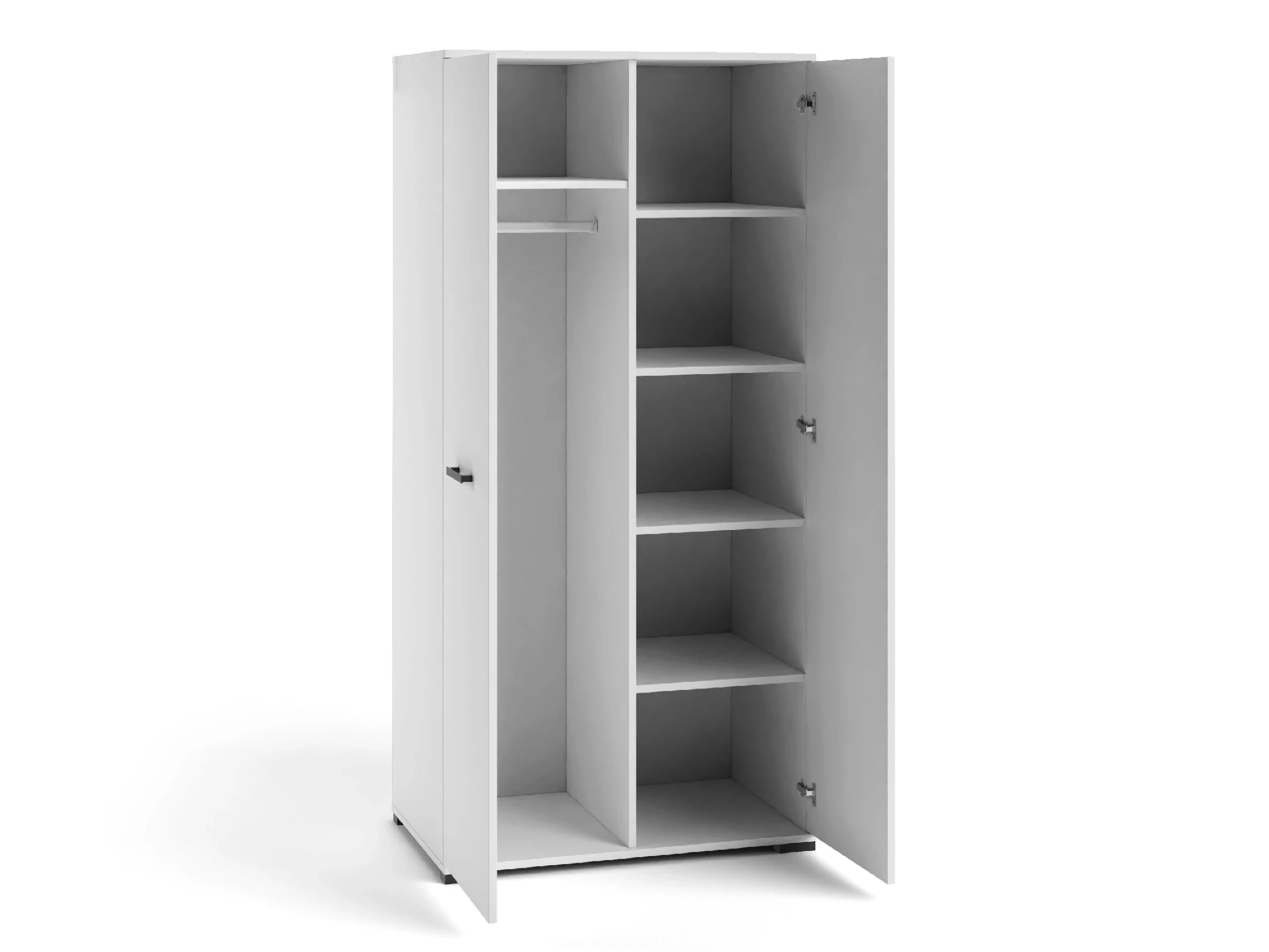 Układ wnętrza ułatwia rozdzielenie rzeczy wiszących od tych składanych, więc łatwiej utrzymać porządek bez dokładania kolejnych organizerów. Drążek daje miejsce na odzież, która powinna pozostać wyprostowana, a półki pomagają posegregować resztę zawartości. To funkcjonalna szafa na ubrania, która łączy prostą formę z wygodnym użytkowaniem na co dzień.