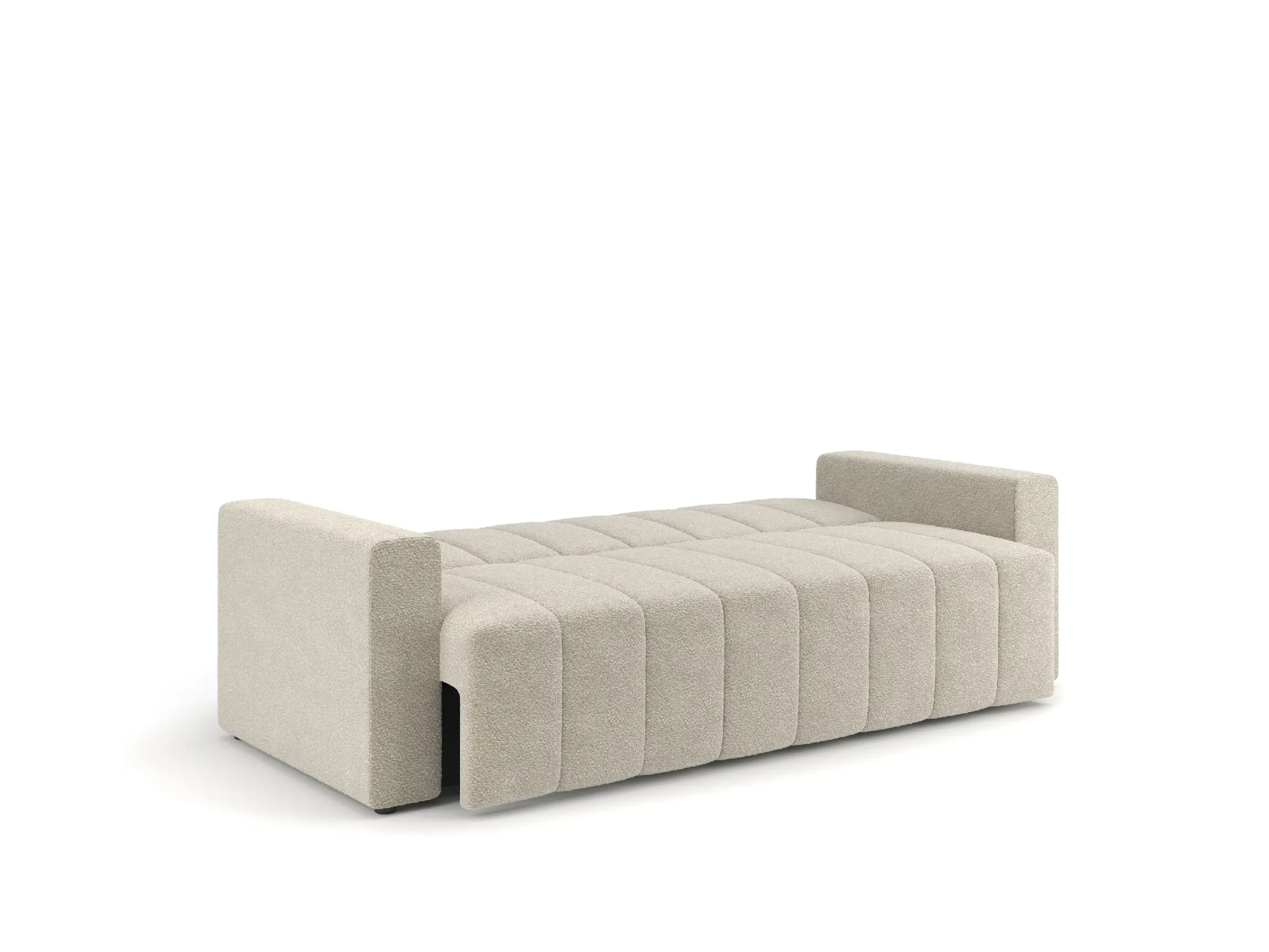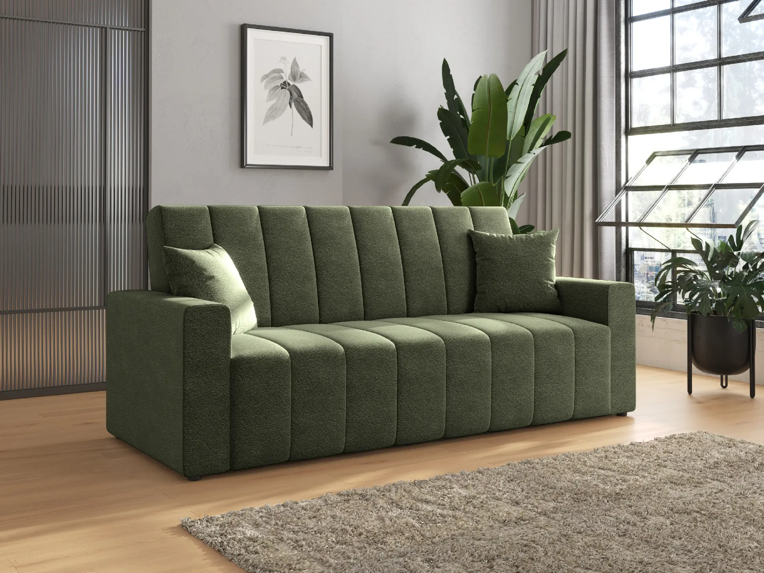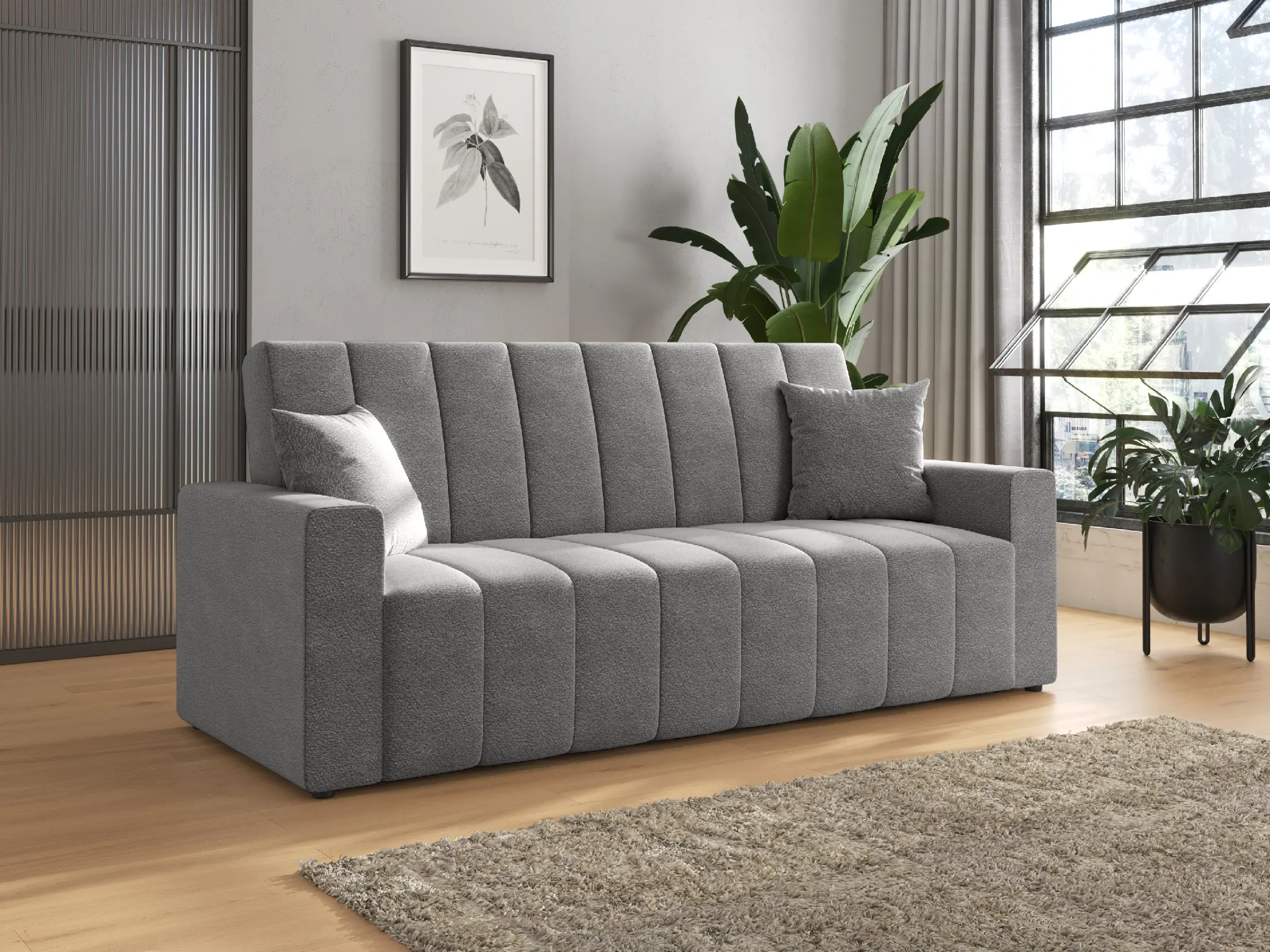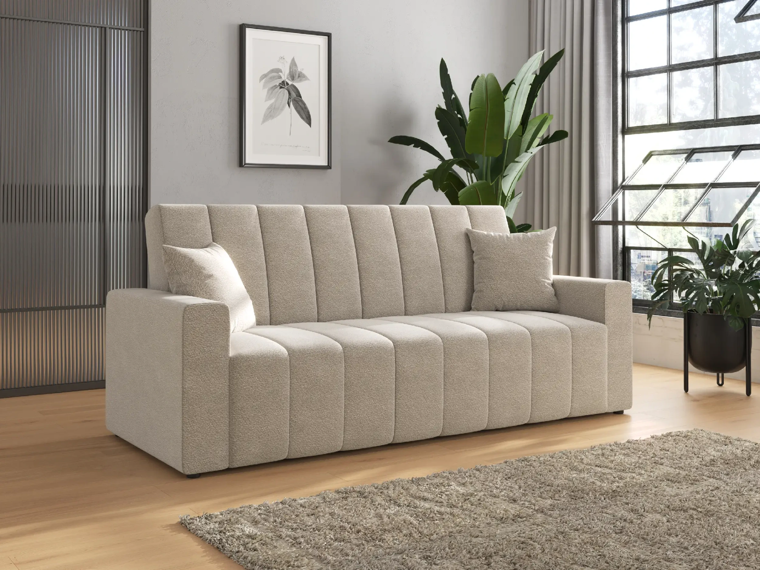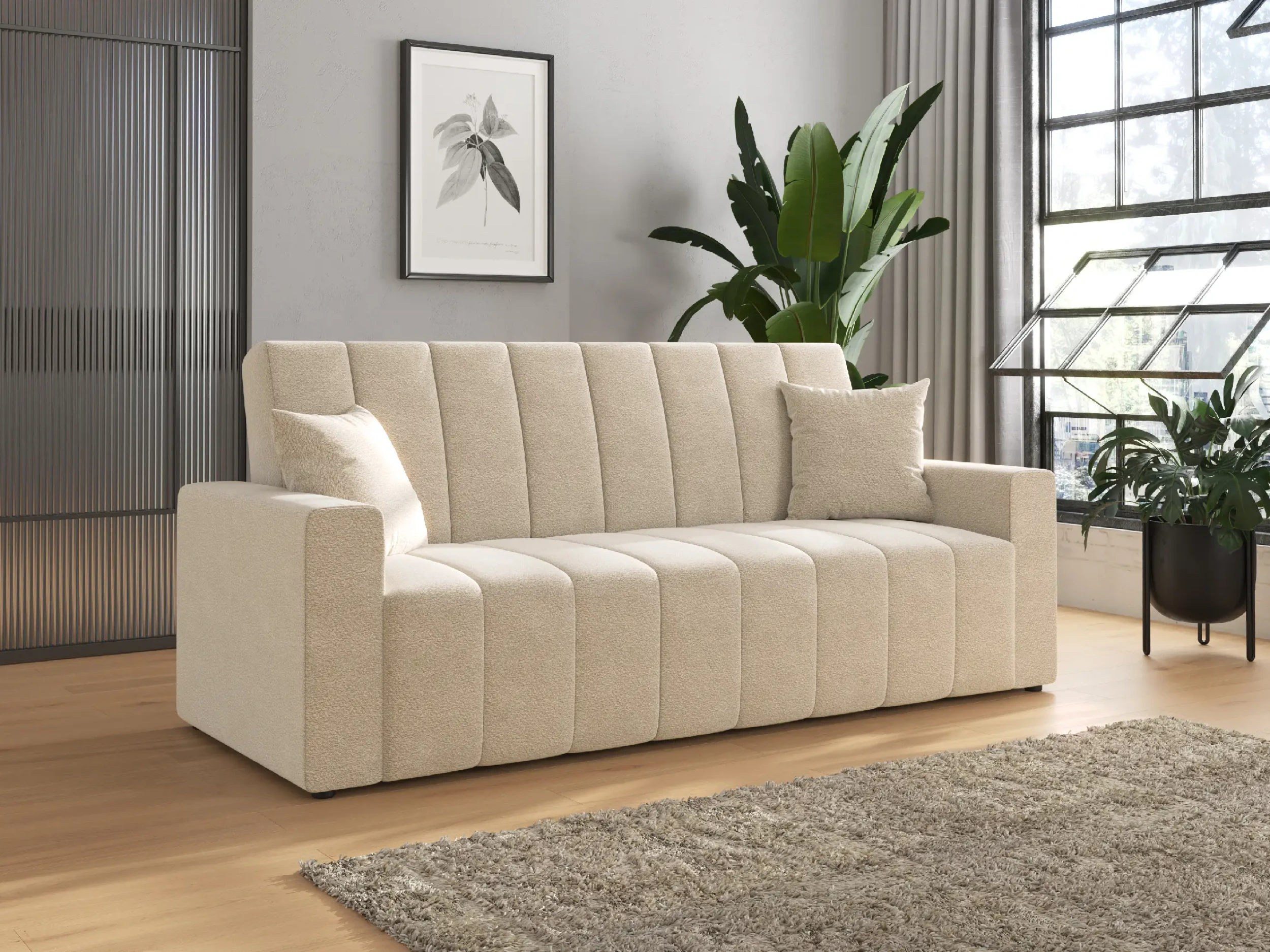 Wersalka rozkładana NUBI to propozycja dla miłośników nowoczesnego designu, którzy cenią sobie funkcjonalność i elegancki wygląd. Charakterystyczne, szerokie pionowe przeszycia nadają jej dynamicznego charakteru i sprawiają, że mebel przyciąga wzrok w każdej aranżacji. Grube boki oraz jednolita forma podkreślają minimalistyczny, a zarazem przytulny styl wersalki, który doskonale wpisuje się we współczesne trendy wnętrzarskie.