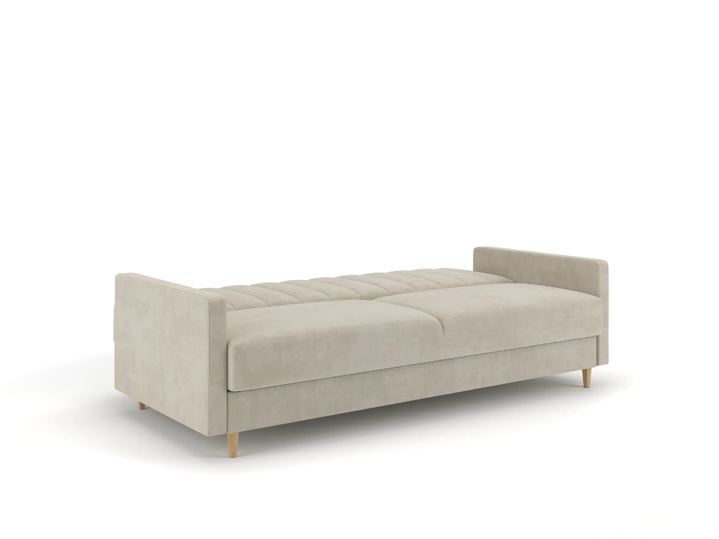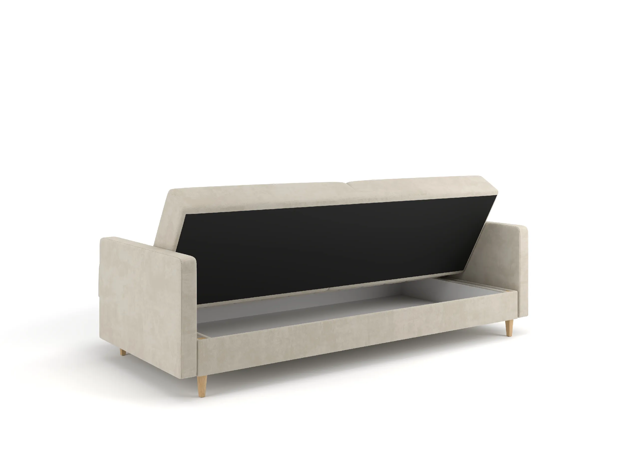 Mebel wyposażono w funkcję spania – rozkładany mechanizm umożliwia szybkie i wygodne przekształcenie sofy w przestronne łóżko. Pojemny schowek na pościel ułatwia przechowywanie kołder, poduszek czy koców, pomagając utrzymać porządek w salonie. Konstrukcja oparta na solidnym stelażu z litego drewna i płyty meblowej zapewnia stabilność oraz wytrzymałość na lata.