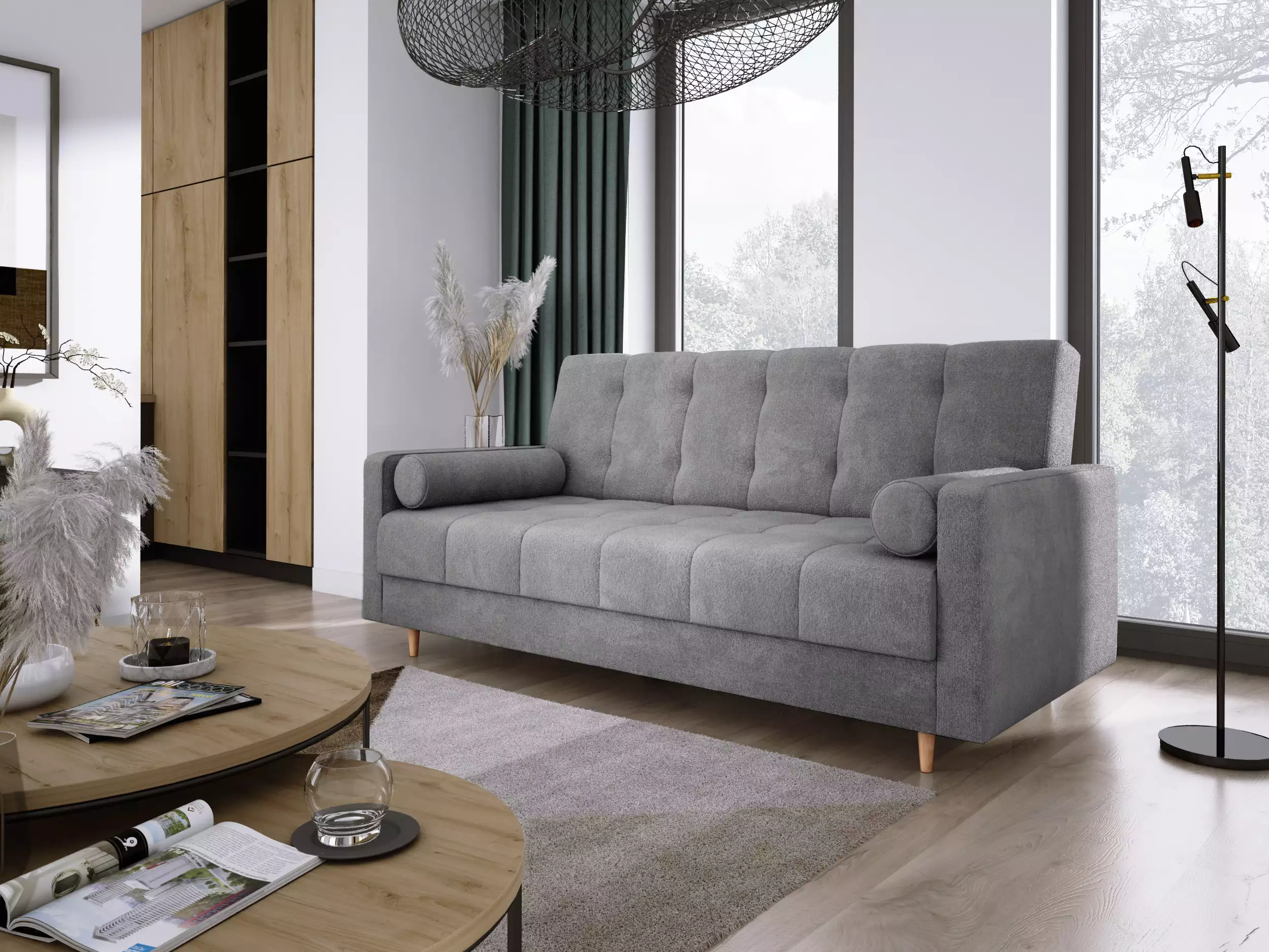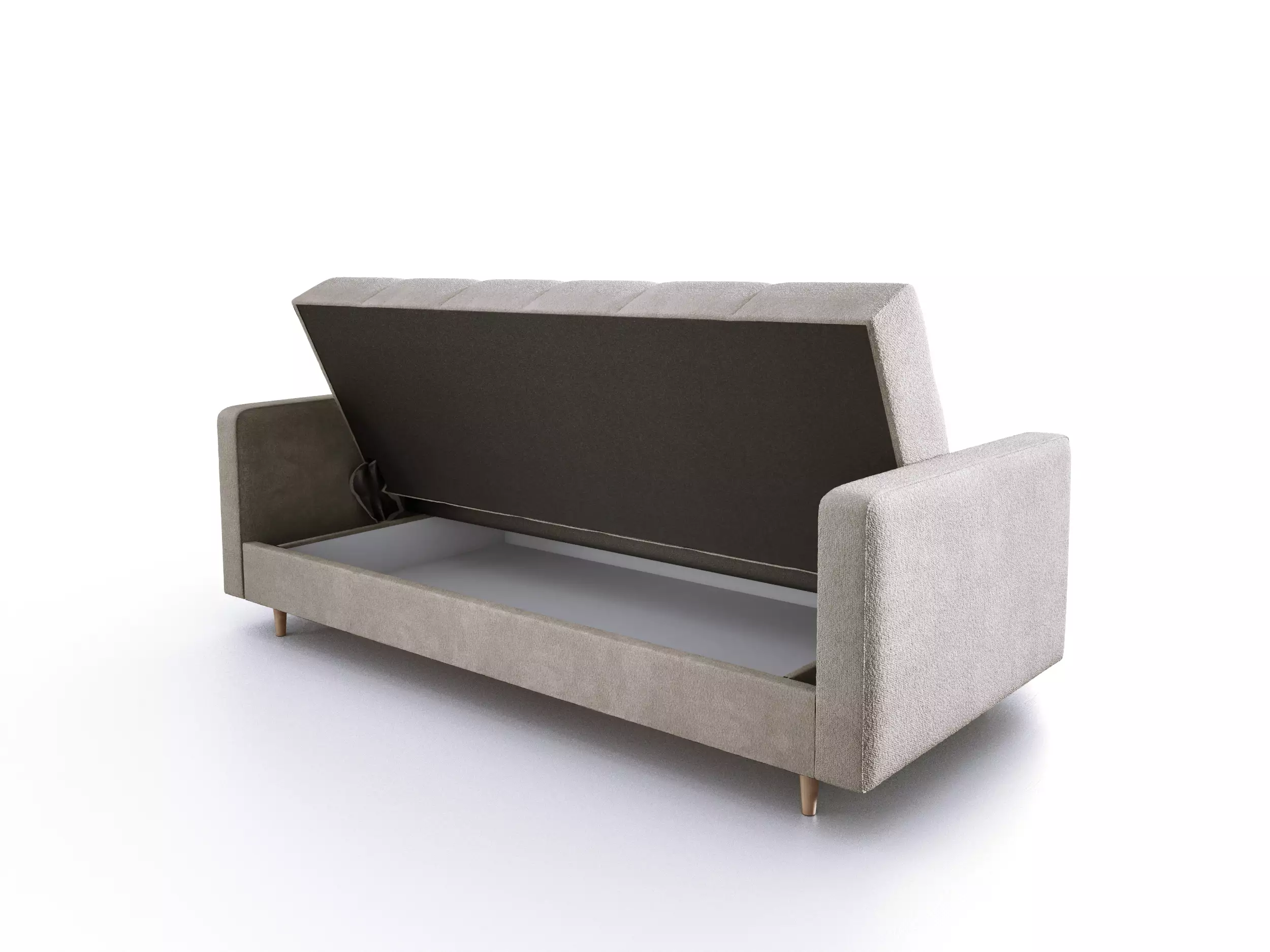 Połączenie sprężyn bonellowych z elastyczną pianką tapicerską zapewnia optymalne podparcie ciała i wygodę zarówno podczas codziennego wypoczynku, jak i snu. System rozkładania klik-klak umożliwia szybkie i łatwe przygotowanie miejsca do spania, a praktyczny pojemnik na pościel pomaga w utrzymaniu porządku. Obicie wykonane z modnej tkaniny bouclé nadaje wersalce Friga wyjątkowy, nowoczesny charakter. Jej miękka, przyjemna w dotyku faktura przypominająca baranka nie tylko podkreśla stylowy design, ale także zwiększa komfort użytkowania.