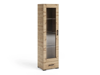 Naturalny odcień dobrze łączy się z bielą, beżami, czernią i zielenią, dlatego łatwo dopasować go do wielu aranżacji. Dolna szuflada daje dodatkową przestrzeń na mniej reprezentacyjne rzeczy, a opcjonalne podświetlenie LED może jeszcze lepiej podkreślić zawartość za szkłem. Jeśli szukana jest witryna szklana o bardziej ciepłym charakterze, ten wariant będzie bardzo udanym wyborem.