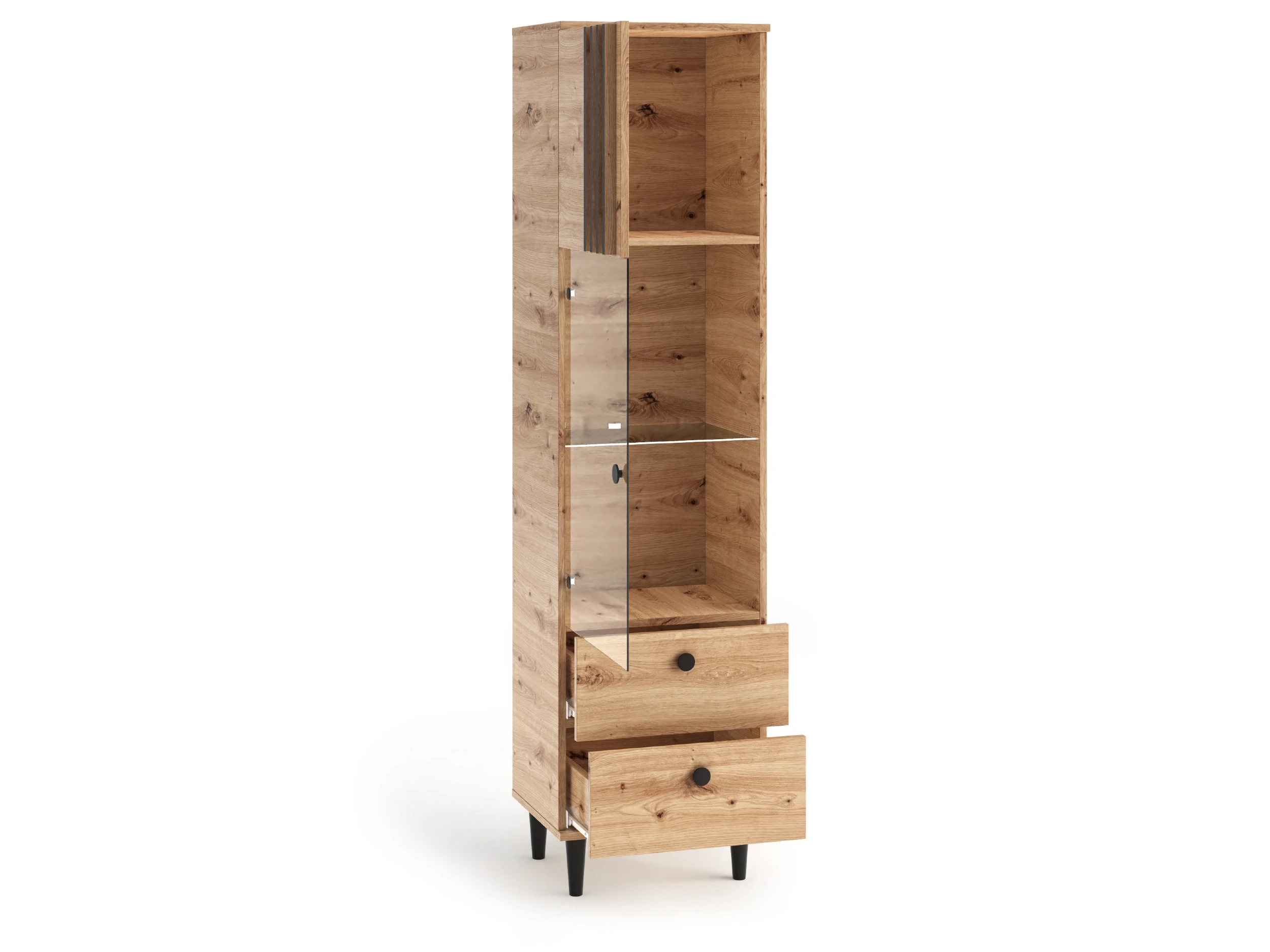 Model LANA L5 posiada częściowo przeszklony front, szklaną półkę oraz dwie praktyczne szuflady na drobiazgi. Czarne lamele oraz uchwyty w ciemnej kolorystyce nadają witrynie nowoczesnego charakteru, idealnie wpisując się w aktualne trendy wnętrzarskie. Wysokie, drewniane nóżki ułatwiają utrzymanie czystości pod meblem i nadają mu lekkości.
