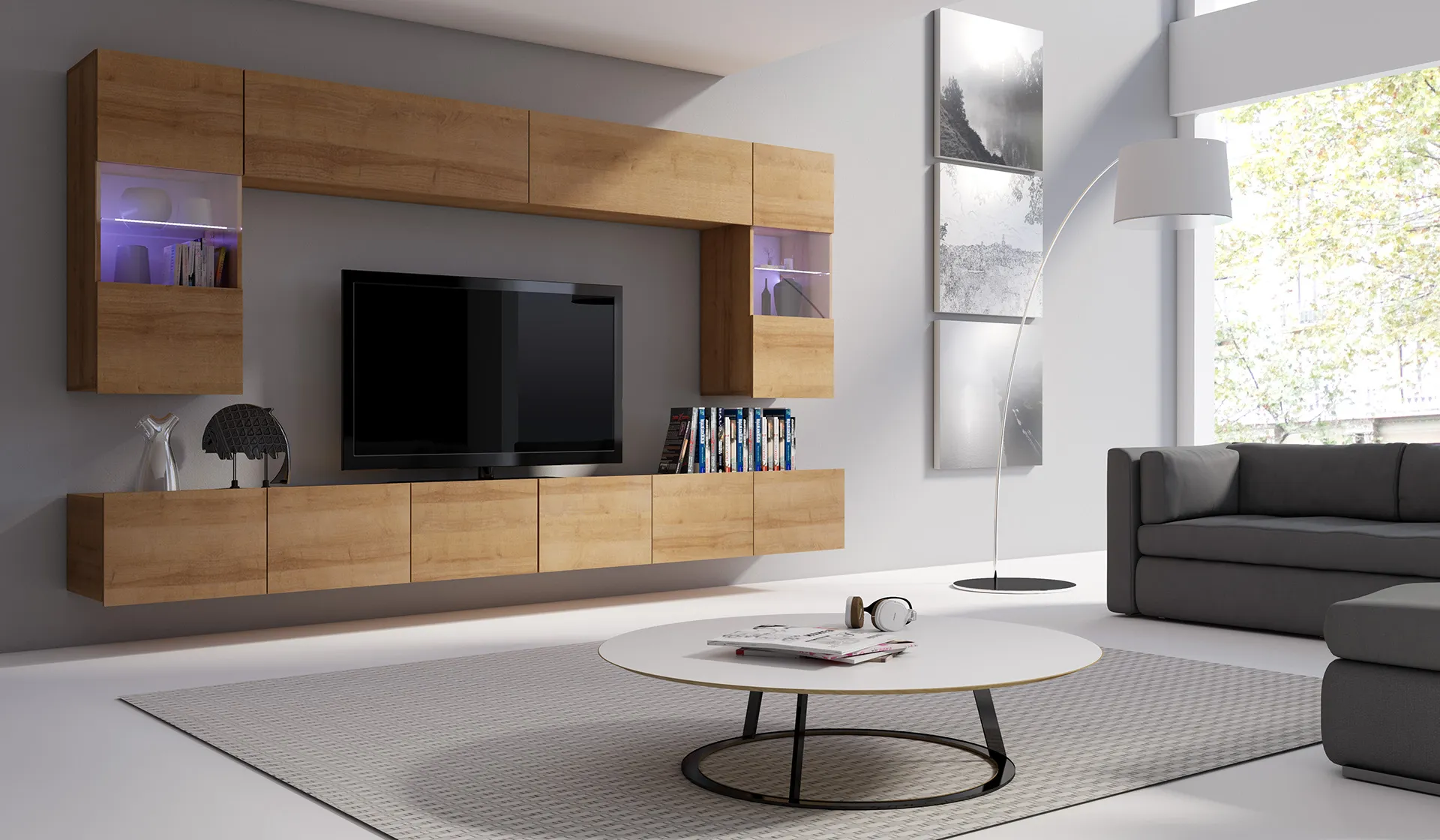 Centralna część witryny została wyposażona w szklaną półkę, która nadaje konstrukcji lekkości i pozwala efektownie wyeksponować dekoracje, książki lub szkło. Zamknięte strefy przechowywania zapewniają porządek i estetyczny wygląd zabudowy ściennej.