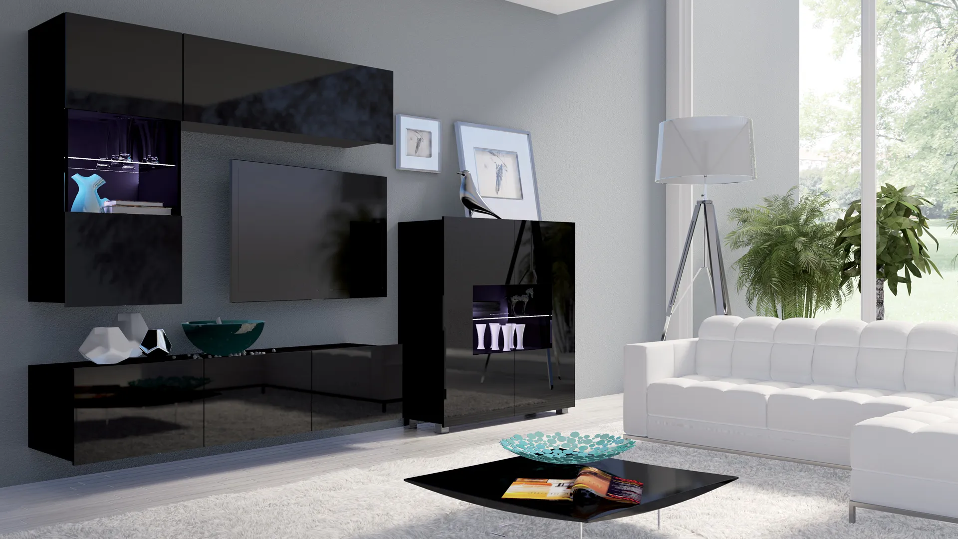 - Zestaw 4 elementów – szafka RTV 150 cm, witryna wisząca pionowa, półka wisząca pozioma i komoda dwudrzwiowa