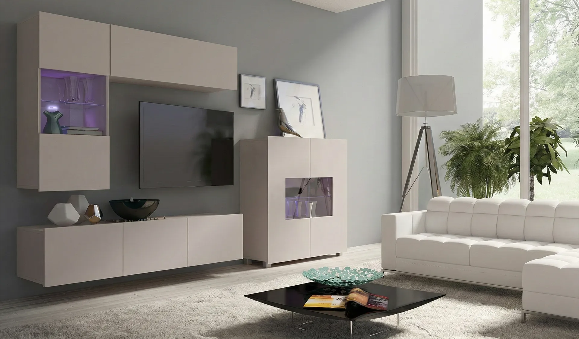 CALERO C3 pasuje do nowoczesnych wnętrz, gdzie liczy się czysta linia: bezuchwytowe fronty podkreślają minimalistyczny styl, a płyta laminowana 16 mm z obrzeżem PCV dobrze sprawdza się w codziennym użytkowaniu. Witryna i komoda mają szkło hartowane, które dodaje lekkości i pozwala bezpiecznie wyeksponować dodatki. Szafkę RTV możesz zamontować w wersji wiszącej, żeby optycznie odciążyć ścianę i ułatwić sprzątanie, albo postawić w opcji stojącej – ze srebrnymi nóżkami 5 cm. Dodatkowo możesz dobrać oświetlenie LED, które wieczorem tworzy przyjemny klimat i podkreśla zawartość witryn.