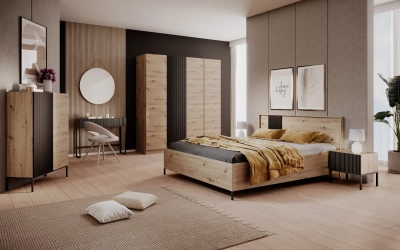 Nadaj swojej sypialni nowoczesnego charakteru z Zestawem Mebli do Sypialni COMO II w efektownym dekorze dąb artisan z czarnymi ryflowanymi frontami. To kompleksowe i stylowe rozwiązanie, które idealnie pasuje do wnętrz w stylu loftowym, industrialnym lub skandynawskim. Połączenie ciepłego dekoru drewna z wyrazistą czernią i frezowanymi detalami na frontach tworzy unikalny i bardzo modny wygląd. Mebelki osadzone są na solidnych, czarnych metalowych nóżkach, co podkreśla ich trwałość i industrialny charakter.
